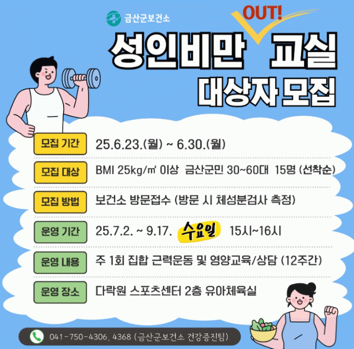 성인 비만 아웃 교실에 관한 자세한 내용은 금산군보건소 건강증진팀에 문의하면 된다.