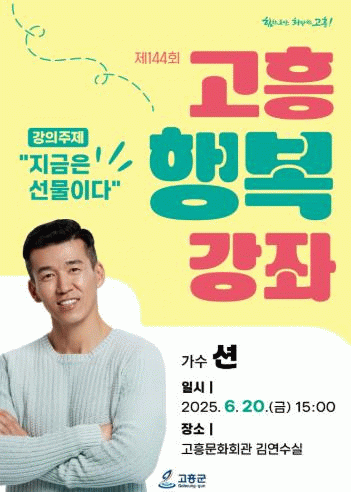 오는 6월 20일 오후 3시 고흥문화회관 김연수실에서 힙합그룹 지누션의 멤버이자 자선 활동가로 잘 알려진 가수 ‘션’이 강사로 나서 ‘오늘은 선물이다’라는 주제로 고흥행복강좌를 개최할 예정이다.