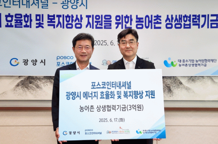 정상경 포스코인터내셔널 경영지원본부장은 “앞으로도 광양시와 긴밀히 협력해 함께 웃고 성장하는 건강하고 활력 넘치는 지역공동체를 만들어 가겠다”며 “이번 3억 원의 기금이 광양 농어촌 현장의 실질적 삶의 질 향상에 기여하고, 지속 가능한 공동체 형성에 소중히 쓰이길 기대한다”고 말했다.
