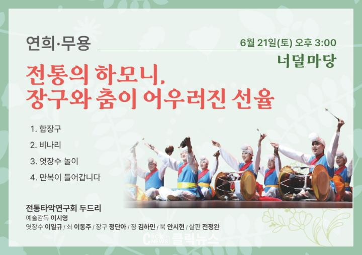 이번 무대는 전라남도 무형유산 제17호 김동언 명인의 설장구를 현대적으로 재해석한 ‘합장구’를 시작으로, 관객의 안녕과 복을 기원하는 ‘비나리’, 조선 팔도를 유랑하며 엿장수의 풍류를 담은 ‘엿장수놀이’, 상모 판굿을 중심으로 줄공, 버나, 살판 등 전통연희의 백미가 어우러지는 ‘전통연희마당’으로 구성된다. 관객은 전통문화의 생명력과 흥의 정수를 온몸으로 느낄 수 있을 것이다.
