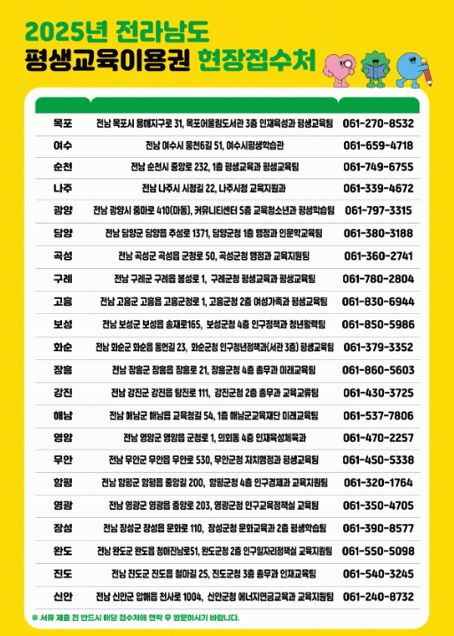 저소득층, 노인, 디지털 교육 희망자는 전남도 평생교육이용권 누리집에서, 장애인은 보조금24에서 신청하면 된다.