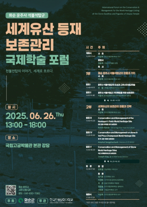 이번 국제학술포럼은 세계유산 잠정 목록에 등재된 화순 운주사 석불석탑군의 보존·관리를 주제로 문화유산 보존·관리 현장에서 활발히 활동하고 있는 국내외 전문가와 관계 당사자를 초청하여 문화유산 보존에 관한 연구 동향을 공유하고, 운주사 석불석탑군의 보존 및 발전 방향을 모색하는 자리이다.