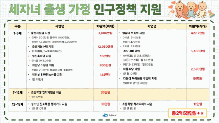 시는 자녀 나이에 따라 ▲출산지원금 3,000만 원 ▲출생기본수당(18년간) 1억 2,960만 원 ▲임신축하금 150만 원 ▲첫만남 이용권 800만 원 ▲임산부 친환경농산물 144만 원 ▲영유아 보육료 422.7만 원 ▲부모급여 5,400만 원 ▲아동수당 2,520만 원 ▲다둥이 육아용품비 50만 원 등 2억 5,446만 원을 지원하고 있다.