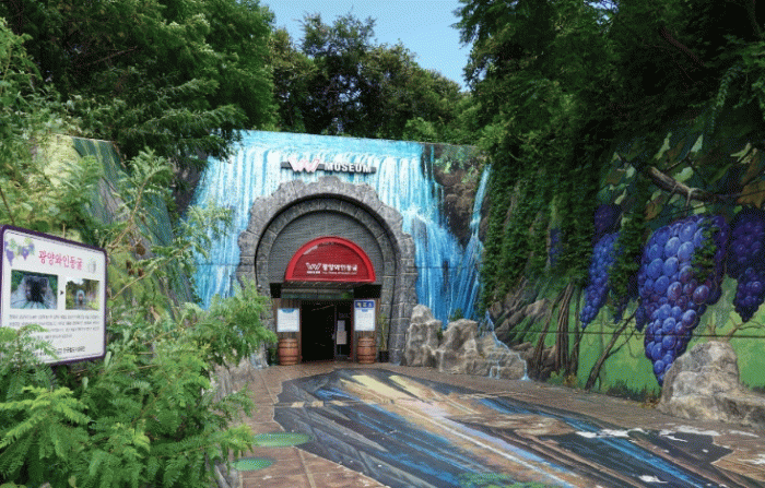 광양와인동굴은 ‘알리바바와 40인의 도둑’의 동굴을 연상시키는 아치형 입구와 살아 움직이는 듯한 착각을 불러일으키는 바닥의 트릭아트 포토존으로 방문객을 맞는다.