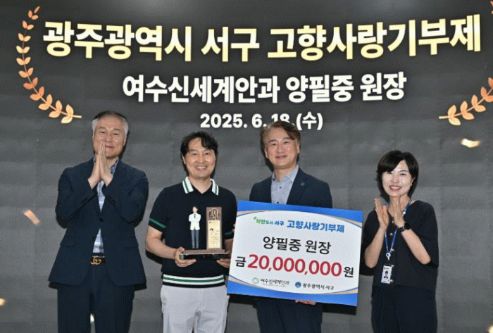 서구는 18일 고향사랑기부금 2천만원을 기부한 양필중 여수 신세계안과 원장에게 감사패를 전달했다고 밝혔다.