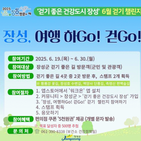 장성군의 대표 걷기 명소인 △황룡강 꽃길 △장성호 수변길 △축령산 편백숲길 △백양사 단풍길 가운데 2곳을 걷고 스탬프를 모아 응모하면, 추첨을 통해 매월 500명에게 5000원 상당 ‘모바일 쿠폰’을 제공한다.