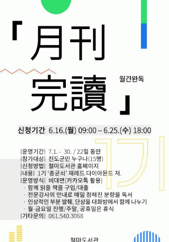참가 신청은 6월 25일까지 진도 철마도서관 누리집에서 할 수 있으며, 프로그램과 관련한 자세한 내용이나 문의 사항은 철마도서관에 문의하면 안내받을 수 있다.
