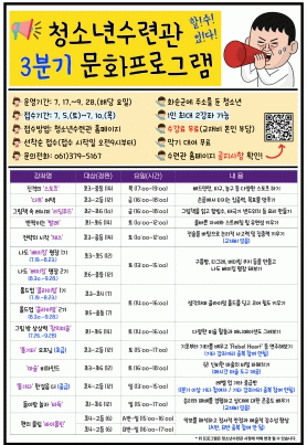 3분기 프로그램은 7월 17일부터 9월 28일까지 운영되며, 화순군에 주소를 둔 청소년은 누구나 참여할 수 있다. 신청은 7월 5일(토)~10일(목)까지 화순군청소년수련관 누리집 프로그램 신청 게시판’을 통해 온라인으로 접수하면 된다. 인기 강좌의 경우 조기 마감될 수 있기에 관심 있는 청소년은 서둘러 신청하고, 참가 확정자는 추후 문자 안내가 이루어질 예정이다.