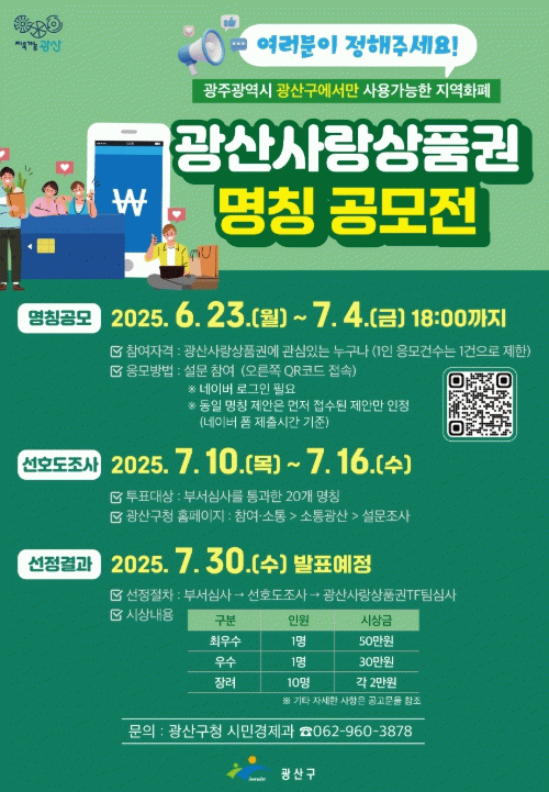 박병규 광산구청장은 “지역 경제 활동을 촉진하고, 소비자와 소상공인‧자영업자 모두에게 이로운 상생 경제 체계를 구축하기 위해 ‘광산사랑상품권’ 발행을 추진한다”며 “새롭게 발행할 지역화폐가 광산구만의 정체성, 차별화된 브랜드 가치를 담은 멋진 이름을 가질 수 있도록 명칭 공모전에 많은 관심과 참여를 바란다”고 말했다.