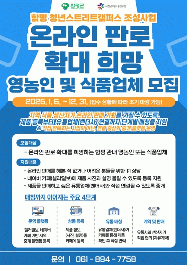 함평군은 지역소멸위기 대응을 위한 ‘청년 스트리트캠퍼스 조성사업’의 일환으로 지역 영농인·소상공인을 대상으로 온라인 판로 확대 지원사업을 추진한다고 22일 밝혔다.