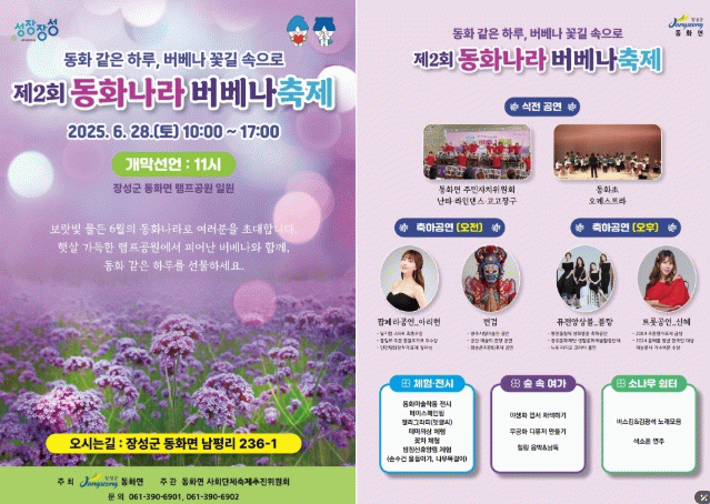 김한종 장성군수는 “동화면을 대표하는 ‘동화나라 버베나축제’가 주민과 관광객 모두에게 감동과 행복을 선사할 것”이라며 “유네스코 세계유산 필암서원, 장성호 수변길, 축령산, 백양사 등 장성의 명소도 함께 방문해 보시기 바란다”고 말했다.