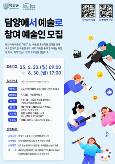 참여신청은 6월 23일부터 6월 30일까지 공고문과 포스터에 첨부된 구글폼으로 접수할 수 있으며, 서류심사를 통해 기획력, 활용 가능성, 참여 의지, 장르 다양성 등을 평가하여 최종 14명의 예술인을 선정한다.