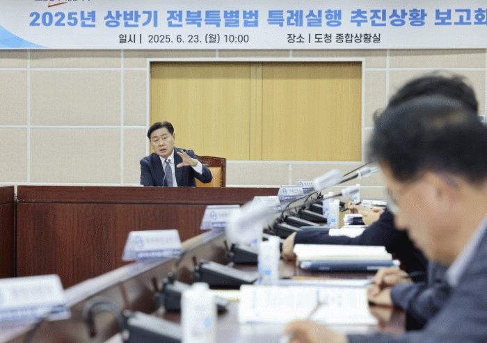 전북자치도는 23일 도청 종합상황실에서 ‘2025년 상반기 전북특별법 특례실행 추진상황 보고회’를 열고, 현재까지의 특례사업 실행 현황을 점검하고 연계 사업 확대 및 제도 개선 전략을 논의했다.