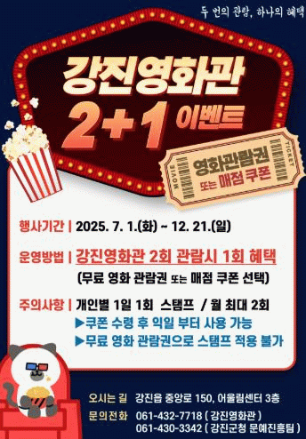 또한 강진군은 7월부터 ‘2+1 이벤트’를 통해 영화 관람 장려와 관객 참여 확대에도 나선다.