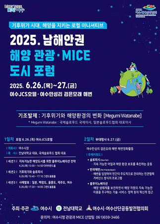 여수시 관계자는 “이번 포럼을 통해 해양 생태의 가치와 마이스(MICE) 산업이 융합된 지속 가능한 발전모델을 제시하고, 해양관광·환경 선도 도시 여수의 가능성을 세계적으로 알리는 기회가 될 것”이라고 밝혔다.