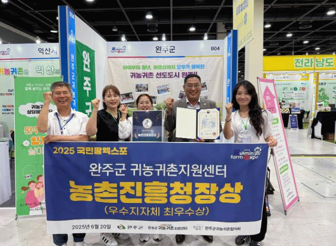 24일 완주군에 따르면 귀농귀촌지원센터는 지난 6월 20일부터 22일까지 서울 양재aT센터 제1전시관에서 열린 ‘2025 국민팜 엑스포’에서 귀농귀촌 활성화 및 지역 홍보 유공을 인정받아 농촌진흥청장상을 수상했다.
