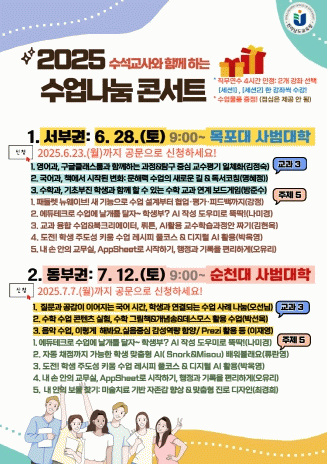 콘서트는 지역별 접근성을 고려해 서부권과 동부권으로 나뉘어 권역별로 운영된다. 28일 서부권 행사에 이어 동부권 행사는 7월 12일 순천대학교 사범대학에서 각각 열린다. 수석교사들이 현장에서 직접 실천한 교과 및 주제별 수업 노하우를 담은 총 8개 강좌가 세션1 ‧ 2로 구성돼 운영된다.