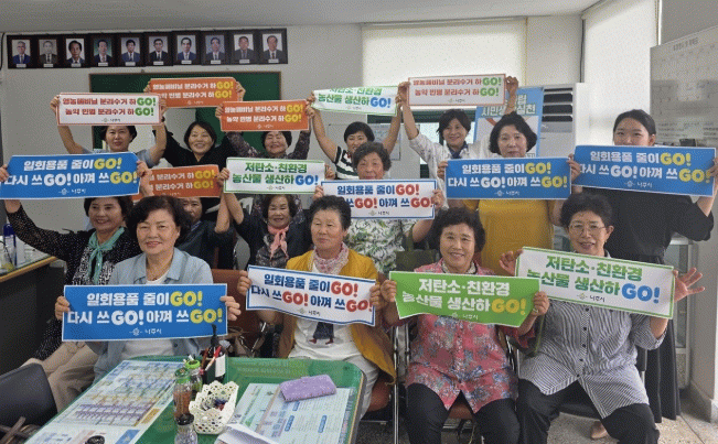 교육을 마친 생활개선회 회원들은 “저탄소 ․ 친환경 농산물 생산하GO!” “일회용품 줄이GO!, 다시 쓰GO!, 아껴 쓰GO!” “영농폐비닐 분리수거 하GO!, 농약 빈병 분리수거 하GO!” 등의 피켓을 들고 슬로건을 외치며 탄소중립 실천 의지를 다졌다.