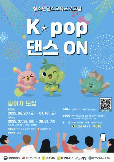 청소년을 위한 열정 가득한 프로그램 ‘K-pop 댄스, ON’은 초등학교 고학년부터 중학생을 대상으로 하며, 리듬감과 민첩성은 물론, 무대 위 자신을 표현하는 용기와 자신감을 길러줄 예정이다.