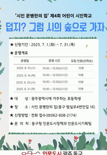 제4회 어린이 시인학교를 참여하고 싶은 학생은 8월 13·14·20·21일 중 희망하는 날을 선택, 인문도시정책과 인문도시기획팀으로 전화 문의·신청하면 된다.
