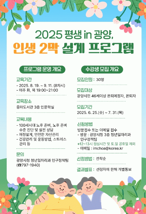 조동수 광양시 청년일자리과장은 “평균수명 100세 시대에 은퇴 후 삶을 준비하는 일은 더 이상 미룰 수 없는 중요한 과제”라며 “이번 인생 2막 설계 프로그램이 시민들의 안정적인 노후 준비에 실질적인 도움이 되길 바란다”고 말했다.