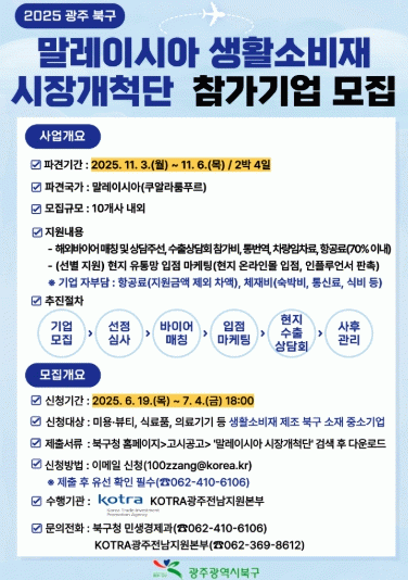 해외시장개척단은 기술력과 시장경쟁력을 갖춘 지역 중소기업의 수출 확대 및 시장 다변화를 지원하기 위해 북구가 지난 2023년 처음 마련한 사업으로 KOTRA 광주전남지원본부와 협업을 통해 추진된다.