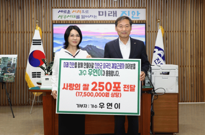 가수 우연이 씨는 “진안군을 여러 번 방문하다 보니 신비로운 마이산, 용담호, 고원지대에서 재배되는 품질 좋은 농산물이 반했다”며 “외국인 계절근로자들이 진안 농업에 함께 힘을 보탠다고 해 작은 도움이 되고 싶은 마음에 가장 필요하다고 생각한 쌀을 기부하게 됐다”고 전했다.
