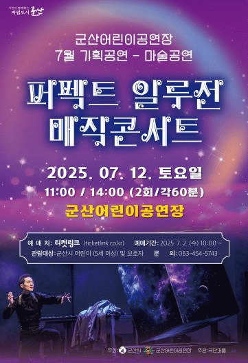 군산어린이공연장 단순한 시연이 아닌 마술의 역사와 미학을 현대적으로 재해석한 종합 예술 무대인 일루전(환영) 마술 콘서트를 통해 어린이와 청소년은 물론 어른 관객에게도 색다른 감동을 전할 계획이다.