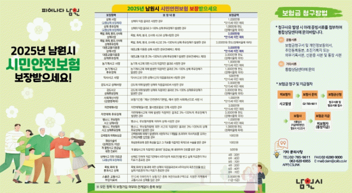 최경식 남원시장은 “시민안전보험은 일상생활 속 예상치 못한 사고에 대비하기 위한 든든한 사회안전망”이라며, “앞으로도 시민의 안전을 최우선으로 고려한 보험 운영과 보장 확대를 지속해 나가겠다”고 밝혔다.