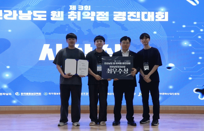 웹취약점 경진대회 본선에는 예선을 통과한 20개 팀이 참가해 치열한 경쟁을 펼쳤으며, 일반부 ‘빛고을시큐리티(이장우 외 2)’팀과 대학생부 ‘웹슬레이어진수병규(양재원 외 2)’팀이 최우수상(전남도지사상)을, ‘해킹전라잘함(오민호 외 2)’팀이 우수상(전라남도지사상)을 수상하는 등 총 11개 팀이 영예를 안았다.