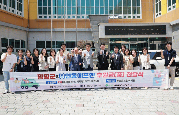 함평군은 29일 “여성의류 전문기업 ㈜인동FN이 지역 어르신 복지를 위해 1억 원 상당의 차량과 후원금을 기부했다”며 “전달식은 지난 26일 함평군 노인복지관에서 진행됐다”고 밝혔다.