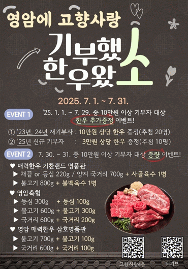 첫째, 2023년이나 2024년에 기부하고, 올해 7월29일까지 거듭 기부한 재기부자에게는 변함없는 영암 사랑에 보답하는 의미로, 추첨을 거쳐 20명을 선발 10만원 상당의 영암한우를 추가 증정한다.