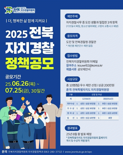 '2025년 전북 자치경찰 정책 공모'에 대한 자세한 내용은 전북자치경찰위원회 홈페이지를 통해 확인할 수 있으며, 문의는 자치경찰정책과로 하면 된다.
