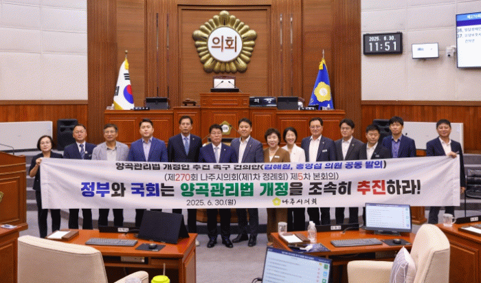 나주시의회는 건의안을 통해 ▲양곡관리법 개정을 조속히 추진할 것과 ▲양곡관리법 개정을 즉각 단행함으로써 국가 존립의 근간인 식량 안보를 지켜낼 것을 강력히 촉구했다.