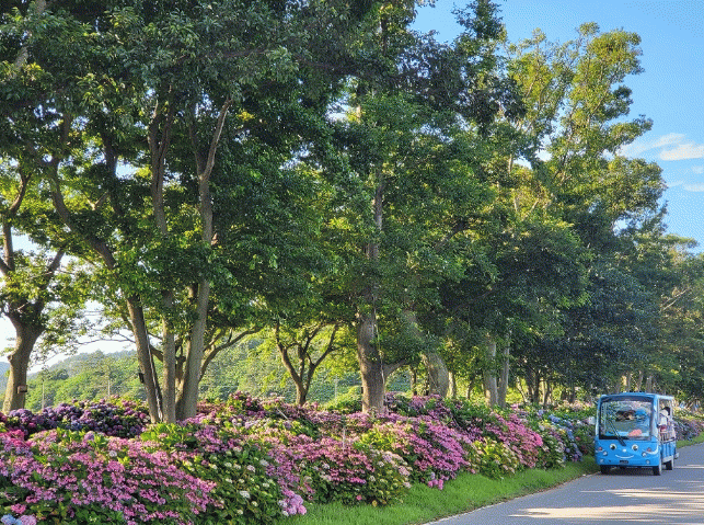 2019년부터 이어져 온 ‘섬 수국 축제’는 지난 6월 20일을 시작으로 10일간 열렸으며, 관람객들은 1억 송이의 수국정원과의 만남을 위해 4km에 이르는 팽나무 숲길을 따라 양쪽으로 핀 수국과 동행하며, 느림의 미학과 함께 인생 한 컷을 남기며 축제장에 도착한다.