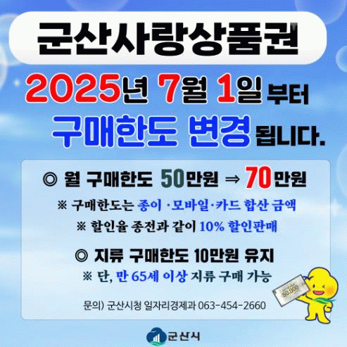 모바일 및 카드형 군산사랑상품권 구매 한도가 기존 월 50만 원에서 최대 70만 원으로 늘어나면, 시민들이 더 많은 할인 혜택을 누리며 지역 내 소비를 활성화할 수 있게 된다.