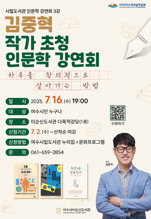 강연회에는 여수시민 누구나 참여 가능하며, 참여 접수는 오는 2일 오전 9시부터 여수시립도서관 누리집에서 90명을 선착순 접수한다.