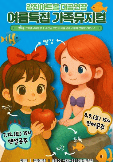 백설공주와 일곱난장이는 12일 오후 3시. 인어공주는 8월 9일 오후 3시에 강진아트홀 대공연장에서 진행된다.
