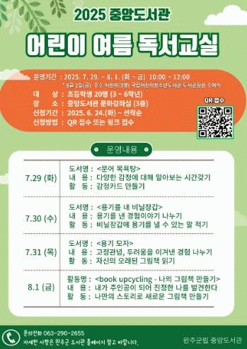 참가 신청은 완주군 중앙도서관 홈페이지의 독서문화행사 안내에서 가능하며, 링크 또는 QR코드를 통한 접수도 가능하다.