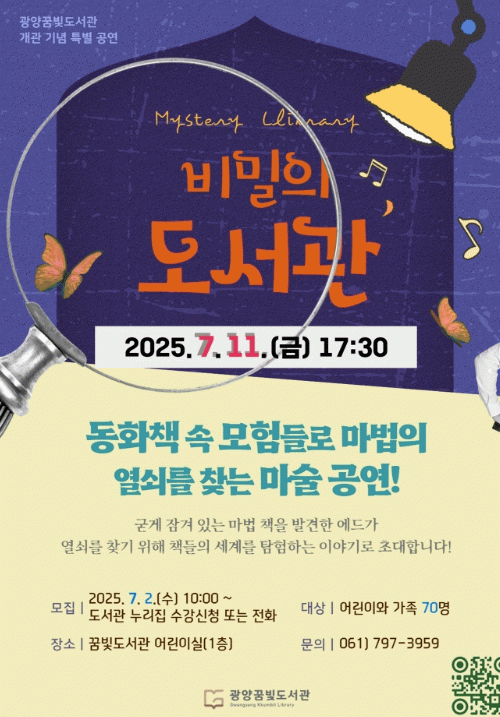 김현숙 광양시 도서관과장은 “마술이라는 소재와 흥미로운 이야기로 자연스럽게 책에 대한 관심을 유도하고, 긍정적인 독서 경험을 제공하고자 이번 공연을 기획했다”며 “어린이와 가족 모두에게 소중한 추억이 되길 바란다”고 말했다.