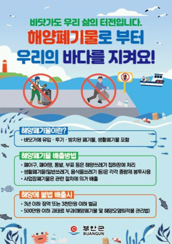 현수막은 효과적인 홍보가 이루어지도록 시인성과 메시지 전달력을 고려한 디자인을 적용하여 관내 주요 어항에 설치했고 리플릿은 총 2,000장을 제작하여 각 읍·면사무소 및 부안수협에 배부하여, 어업인과 지역 주민들에게 해양쓰레기 관련 법령, 실천 방안 등을 널리 알리고 있다.