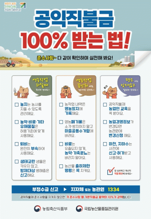 기본형 공익직불제는 농업・농촌의 공익적 기능을 증진하면서 농업에 종사하는 농업인의 소득안정을 위해 직불금을 지원하는 제도로, 직불금을 100% 받기 위해서는 법령에서 정한 16가지 준수사항을 모두 실천해야 한다.