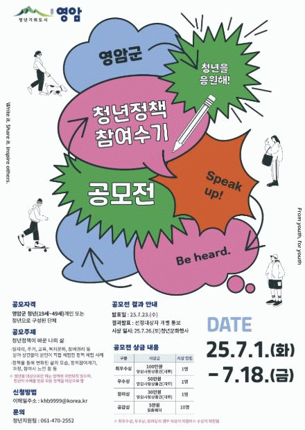 영암군민인 19~49세 청년과 청년단체가 공모전에 참여할 수 있고, 심사를 거쳐 최우수상 100만원, 우수상 50만원, 장려상 30만원을 수여한다.