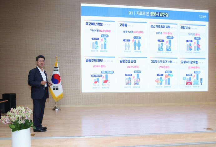 정 시장은 “지난 3년 동안 광양시는 여러 분야에서 괄목할 만한 성과를 달성했다”며 대표 성과로 ▲전남 유일 3년 연속 인구 증가 ▲이차전지 산업 메카 등극 및 청정 수소도시 조성으로 광양 미래 100년의 기틀 마련 ▲소상공인·중소기업 맞춤 지원 및 ‘기업하기 좋은 도시’ 구현으로 광양 경제 체력 강화 ▲체류형 관광객 유치를 위한 관광 인프라 확충 ▲소득이 보장되는 풍요로운 농촌 건설 ▲청년이 꿈꾸는 청년친화도시 조성 ▲전국 유일 생애복지플랫폼 1.0 완성(370개 복지정책) ▲문화·예술·체육 저변 확대 ▲전남 최고 수준 안전도시 및 탄소중립 도시 도약 ▲정주기반 확보 ▲‘MY광양’, ‘굿잡광양’ 등 시민편의 서비스 구축 등을 꼽았다.