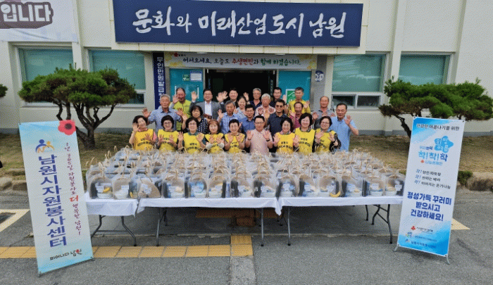 앞서 남원시자원봉사센터는 자원봉사자 40여명과 함께 팔토시, 모자, 수건 등으로 구성된 여름 꾸러미 및 갈비탕을 제작했으며, 제작된 꾸러미와 갈비탕은 주생면행정복지센터와 협력하여 어르신 100명에게 전달했다.