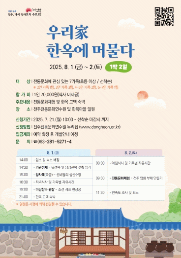 전주시 한옥마을사업소장은 “독립 유공자의 집 등 역사적 의미가 깊은 한옥에 머물며, 잊혀가는 우리의 전통문화를 직접 보고, 듣고, 체험할 수 있는 시간을 통해 아이들에게 잊지 못할 여름방학을 선사할 수 있을 거라고 기대한다”면서 “특별한 추억을 만들고 싶은 가족들의 많은 참여를 바란다”고 전했다.