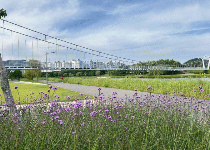 현재 동천변과 오천그린광장 일원에는 긴 줄기 끝에 둥근 이삭 모양의 보라색 버들마편초가 만개해 눈길을 사로 잡고 있다.
