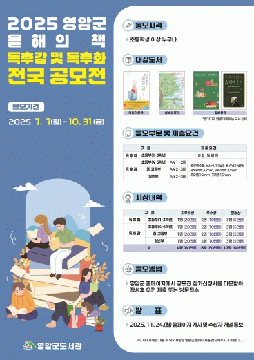 노재영 영암군 인재육성체육과장은 “올해의 책으로 영암을 전국에 알리고, 책을 사랑하는 국민이 영암을 찾는 계기를 만들겠다. 전국 많은 독서인들의 공모전 참여를 바란다”고 당부했다.