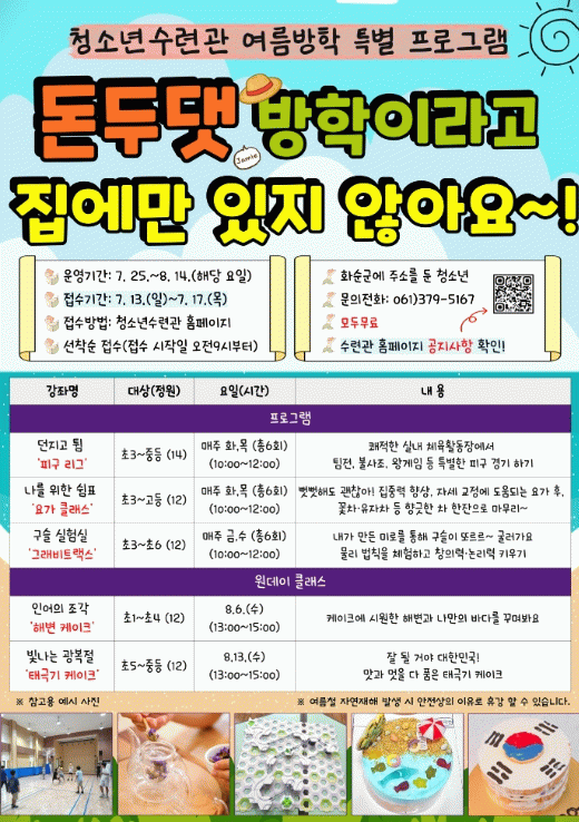 지원 대상은 화순군에 주소를 둔 청소년이며, 신청은 7월 13일 오전 9시부터 17일까지 화순군청소년수련관 누리집프로그램 신청’ 게시판을 통해 선착순으로 접수한다.