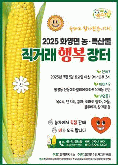 현장에는 화양면에서 출하된 옥수수와 단호박, 블루베리, 양파, 마늘 등이 판매되며 찐 옥수수, 콩물 등을 판매하는 먹거리 부스도 함께 운영될 예정이다.
